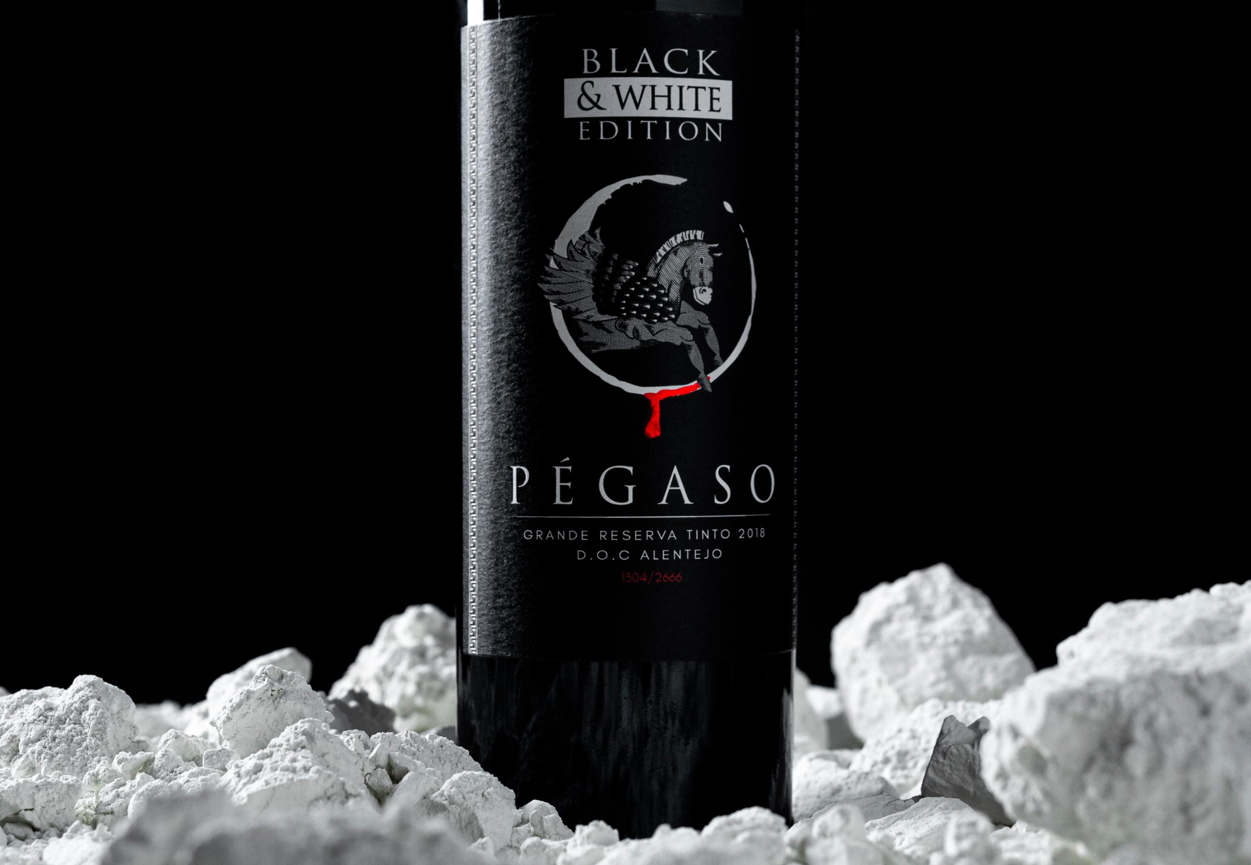 PÉGASO BLACK AND WHITE EDITION GRANDE RESERVA 2018. Um vinho completamente diferente da edição anterior (PÉGASO GRANDE RESERVA TINTO 2017), com a adição de 5% de vinho branco ao Alicante de 2018, que estagiava há meses em barricas. São assim 2666 garrafas numeradas, vedadas com rolha flor 45×24 da melhor qualidade, rotulada em papel texturado, e encaixotadas em caixas personalizadas.
